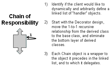 The pattern chains the receiving objects together, and then passes any request messages from object to object until it reaches an object capable of handling the message. The number and type of handler objects isn't known a priori, they can be configured dynamically. The chaining mechanism uses recursive composition to allow an unlimited number of handlers to be linked.