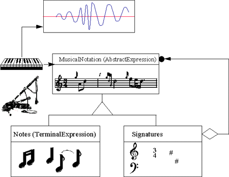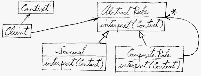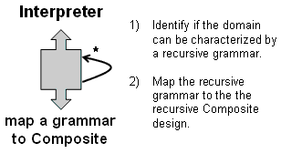 An abstract base class specifies the method interpret(). Each concrete subclass implements interpret() by accepting (as an argument) the current state of the language stream, and adding its contribution to the problem solving process.
