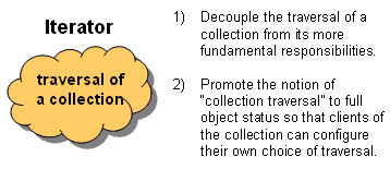 The Iterator abstraction is fundamental to an emerging technology called "generic programming". This strategy seeks to explicitly separate the notion of "algorithm" from that of "data structure". The motivation is to: promote component-based development, boost productivity, and reduce configuration management.