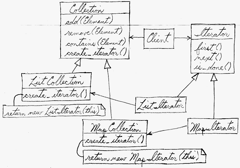 The Client uses the Collection class’ public interface directly. But access to the Collection’s elements is encapsulated behind the additional level of abstraction called Iterator. Each Collection derived class knows which Iterator derived class to create and return. After that, the Client relies on the interface defined in the Iterator base class.