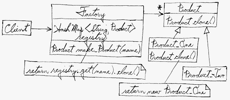 The client then, instead of writing code that invokes the "new" operator on a hard-wired class name, calls a "clone" operation on the abstract base class, supplying a string or enumerated data type that designates the particular concrete derived class desired.