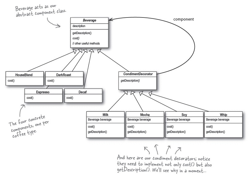 The Decorator pattern demonstrates how to support many permutations of core and optional features in software – all the features are mapped to classes that each implement a common interface, and then the user can mix and match any set of features she desires. [Michael Duell, "Non-software examples of software design patterns"] |