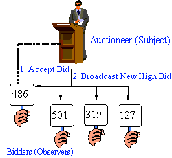 ![]() | The Observer defines a one-to-many relationship so that when one object changes state, the others are notified and updated automatically. Some auctions demonstrate this pattern. Each bidder possesses a numbered paddle that is used to indicate a bid. The auctioneer starts the bidding, and "observes" when a paddle is raised to accept the bid. The acceptance of the bid changes the bid price which is broadcast to all of the bidders in the form of a new bid. [Michael Duell, "Non-software examples of software design patterns", Object Magazine, Jul 97, p54] |