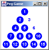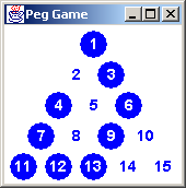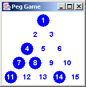 (3-10 7-2 12-14) 9 pegs left (3-10 7-2 (6-13 7-2 14-5 3-10) ) 8 pegs left (3-10 7-2 (6-13 7-2 14-5 (7-2 14-5 10-8) ) ) 7 pegs left (3-10 7-2 (6-13 7-2 14-5 (7-2 14-5 (7-2 7-9) ) ) ) 6 pegs left (3-10 7-2 (6-13 7-2 14-5 (7-2 14-5 (7-2 (14-5) ) ) ) ) 5 pegs left (3-10 7-2 (6-13 7-2 14-5 (7-2 14-5 (7-2 ((4-6)) ) ) ) ) 4 pegs left (3-10 7-2 (6-13 7-2 14-5 (7-2 14-5 (7-2 (( )) ) ) ) ) 3 pegs leftAt this point, the pegs remaining are 1, 6, 11; and there are no more possible moves.