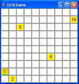 Grid GameI created this game as a Java GUI lab. Click on a grid location and the "distance" to the target is displayed. "Distance" is defined as "delta X plus delta Y". To the right, I clicked on the cell at row 2 and column 2. My second selection was 4 rows down and 4 columns right. My third selection was 3 columns right and 5 rows up. You will notice the "16" cell is 8 steps away from both "8" cells. The fourth selection was off by 2 steps. And the fifth selection hit the target.This is a remarkable vehicle for iteratively demonstrating programming ... 1. Draw the board and quit.