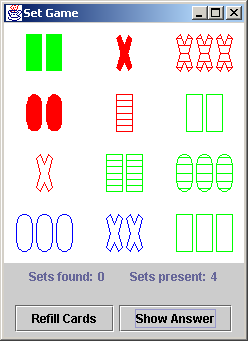 int number_of_sets = 0; for (int i=0; i < cards_showing.length - 2; i++) for (int j=i+1; j < cards_showing.length - 1; j++) for (int k=j+1; k < cards_showing.length; k++) { test_set[0] = cards_showing[i]; test_set[1] = cards_showing[j]; test_set[2] = cards_showing[k]; if (is_a_set( test_set )) { number_of_sets++; answer.append(test_set[0]+1).append(' '); answer.append(test_set[1]+1).append(' '); answer.append(test_set[2]+1).append(" "); } } return number_of_sets;
