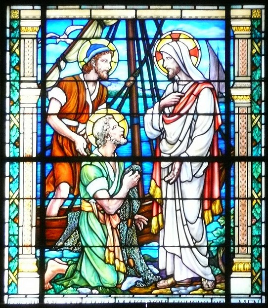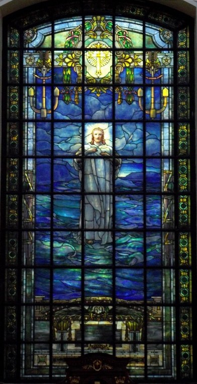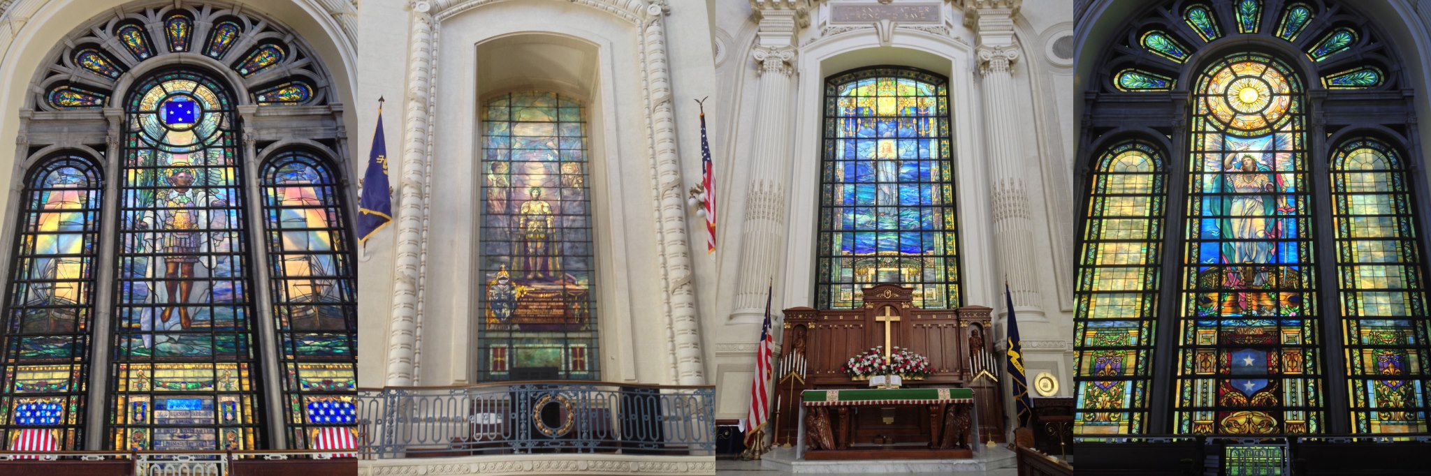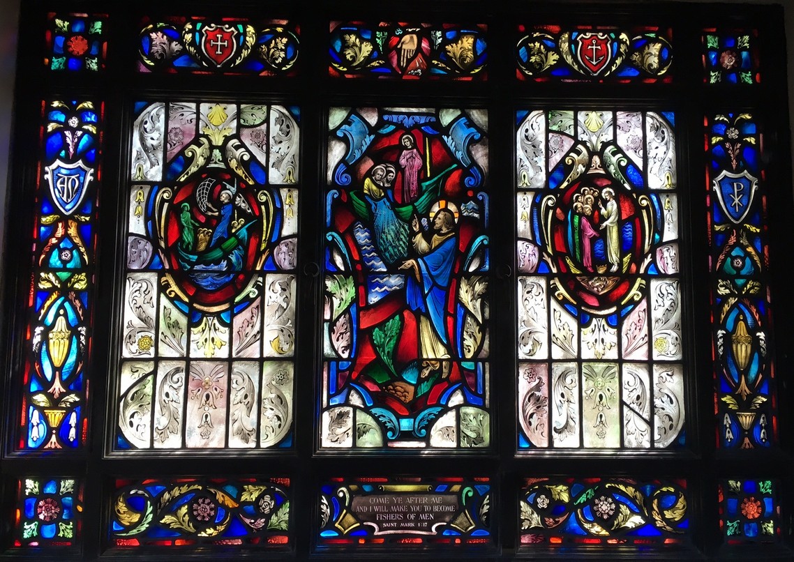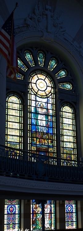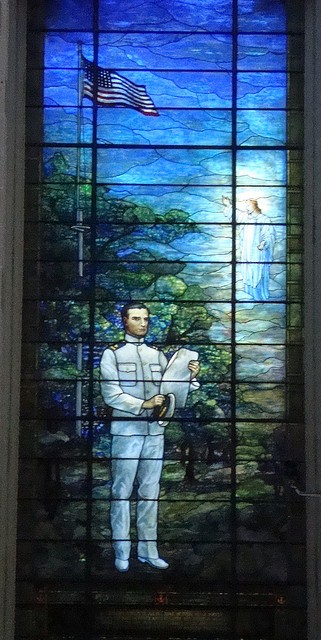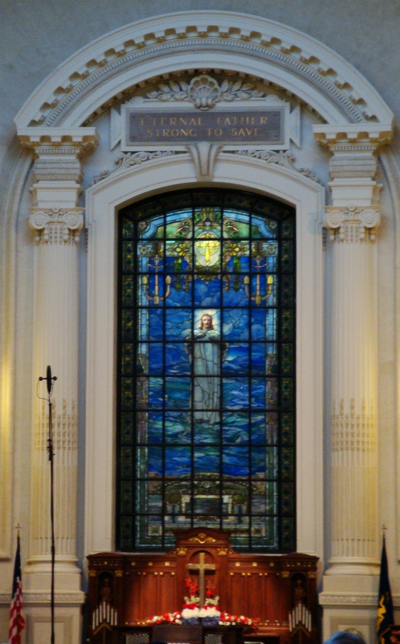 The Sampson Window (below) ... This window is a memorial to Rear Admiral William Thomas Sampson, and is directly opposite the Farragut Window. The portion of the window above the mezzanine was presented in 1909 by the officers and men of the U.S. Navy, and portrays a Winged Peace. The lower portion of the window was a gift of the U.S. Naval Institute in 1941 and shows Saint Peter and Saint Andrew mending their nets: the figure of Christ calls to them: FOLLOW ME AND I WILL MAKE YOU FISHERS OF MEN."