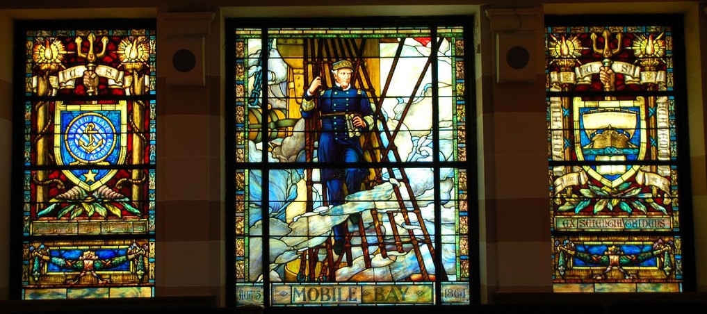 The next day, when passing Fort Morgan in the narrow channel leading to the inner bay, and at the crucial moment, the ships ahead became confused as one of them was sunk by a mine and another stopped. Farragut silently called on God for guidance as to whether he should turn to starboard or to port in order to escape the mine field. As though in a vision, he instantly saw the way was to port. The figure of the angel symbolically points to its own left. At the top of the window is the Admiral's motto: God is My Leader."