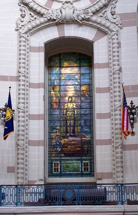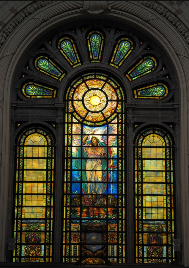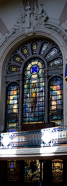 In the lower portion of the window (below the mezzanine) stands the figure of Farragut in the rigging of his flagship HARTFORD. He had gone aloft for a better view during the battle of Mobile Bay. A solicitious sailor, John H. Knowles, Quartermaster, had followed his admiral and passed lashings around him in case Farragut were to be wounded and fall. The upper part of the window show an angel guiding Farragut to victory. The rainbow is used as an emblem of hope and promise and is the keynote of the coloring of the window.