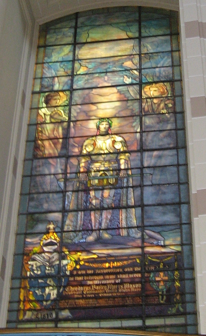 The Mason (aka Sir Galahad) Window (below) ... To the left of the Sampson Window is a memorial window presented by the family of Lieutenant Commander Theodorus Bailey Myers Mason, USN. Depicting a Christian Soldier with his unsheated sword, it was presented in 1899, first installed in the second Chapel and later moved to its present location."