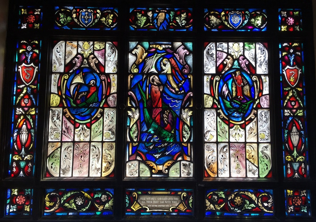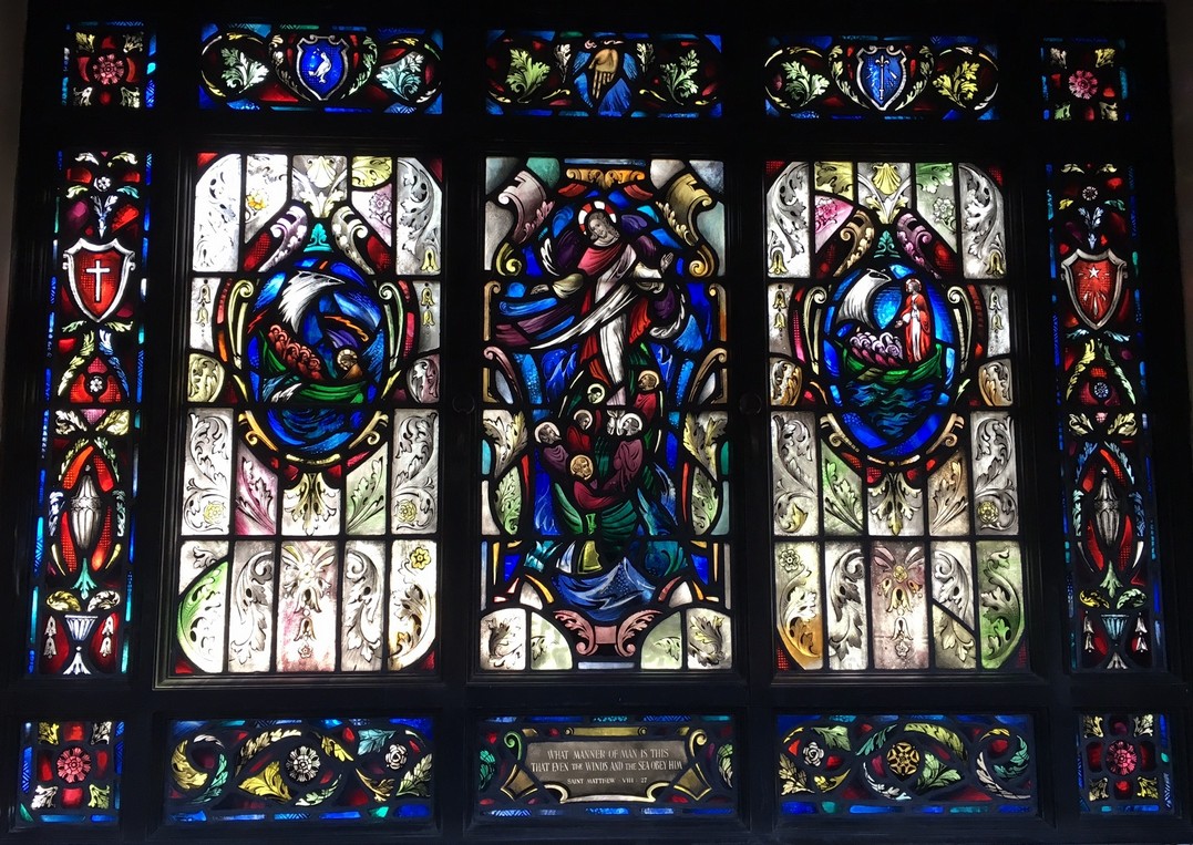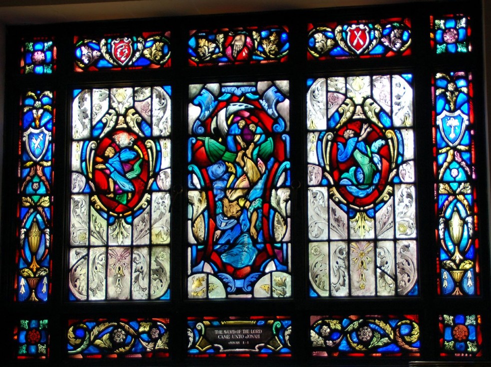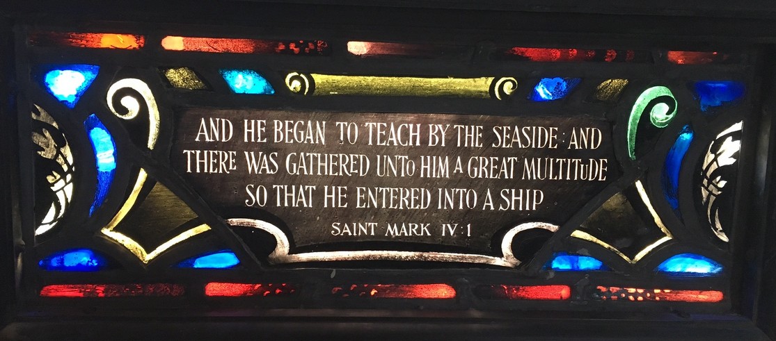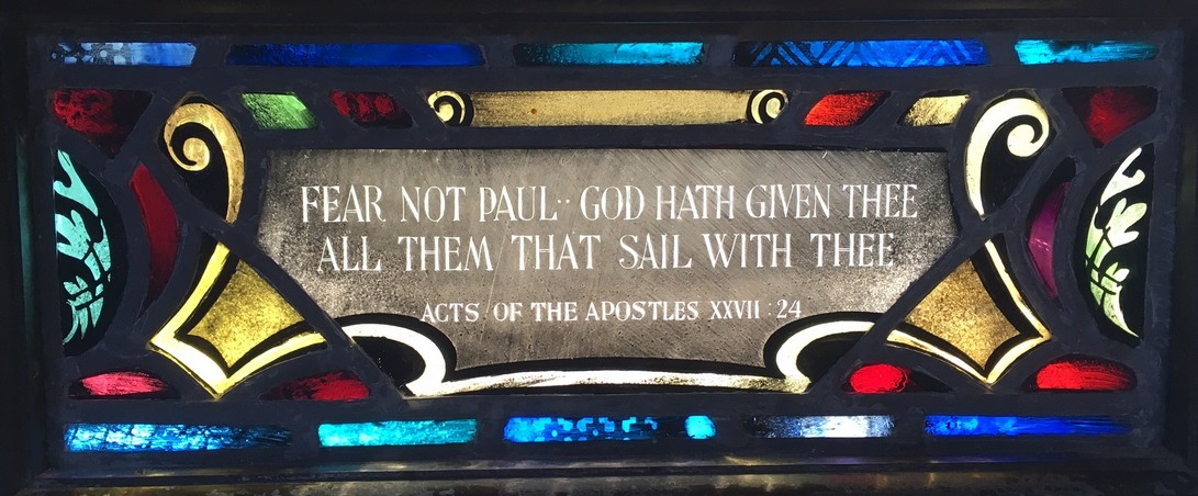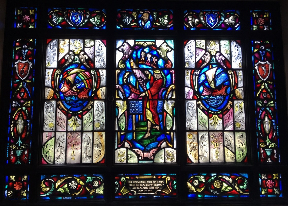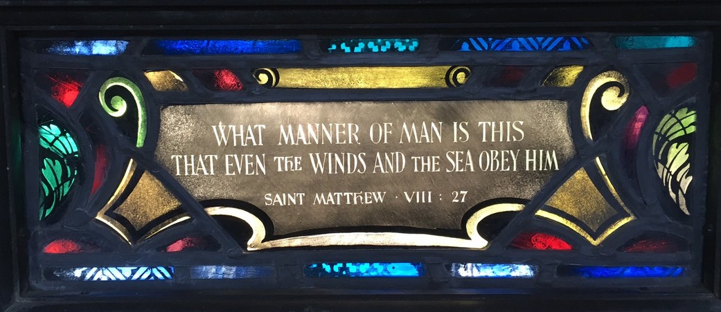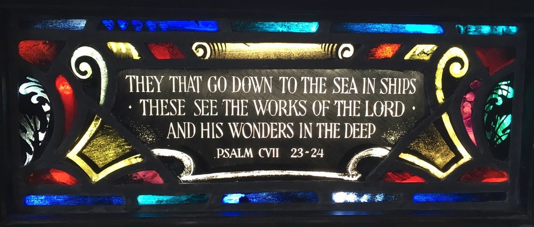 Windows in the "new" nave ... The theme of the eight windows in the extension of the nave (below) is significant for the divine source of inspiration and strength to all men who "go down to the sea in ships." The first four represent verses from the Old Testament. The next four are verses from the New Testament.