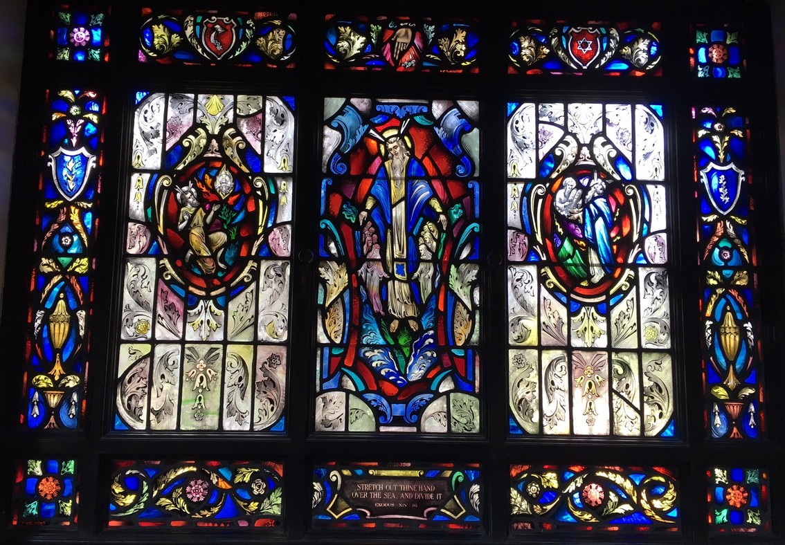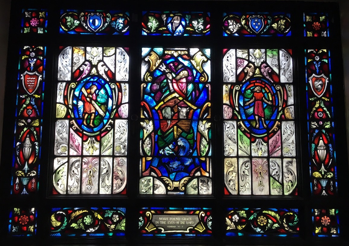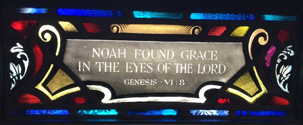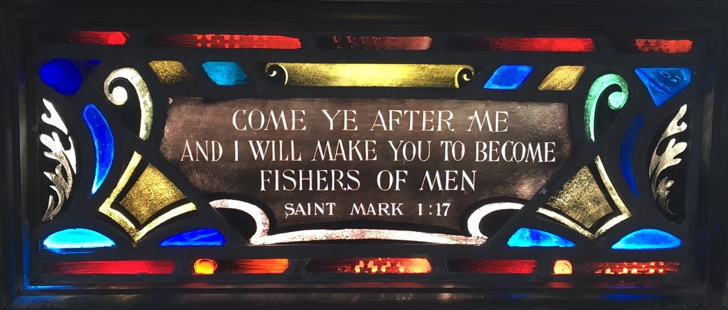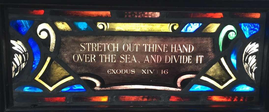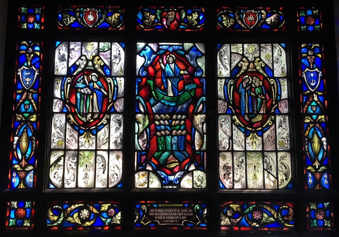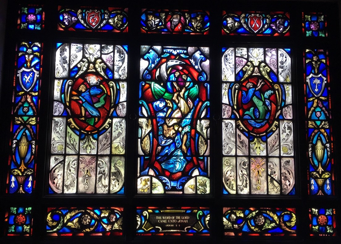 Windows in the "new" nave ... The theme of the eight windows in the extension of the nave (below) is significant for the divine source of inspiration and strength to all men who "go down to the sea in ships." The first four represent verses from the Old Testament. The next four are verses from the New Testament.