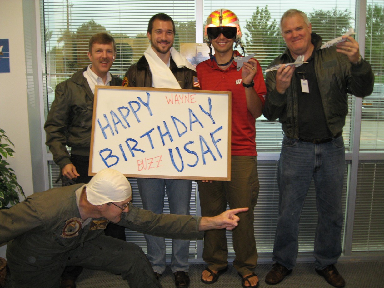 I learned that both of our Air Force veteran co-workers were not going to be in town for the Air Force's birthday. In the spirit of "find reasons to make a big deal out of little things", I brought in a bunch of flight gear, and suggested a dress-up photo op. [Aside: I was surprised at how reticent my highly paid engineer co-workers were to participate in group silliness.]