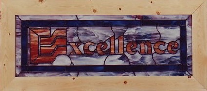 | The E-Systems logo is an abstraction of the letter 'E' and three 'S's. I imagined that the logo could be merged with the virtue "excellence". This piece was displayed proudly in the front office of the Software Engineering department. |